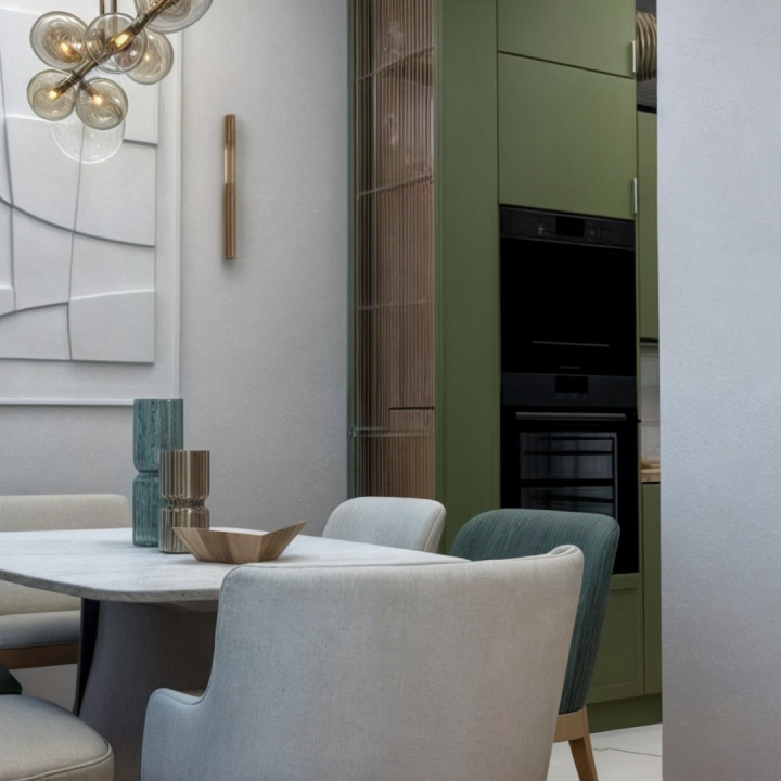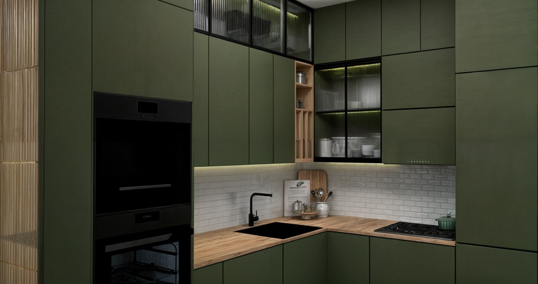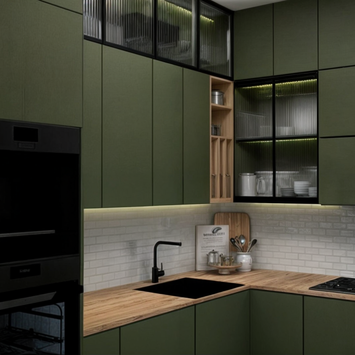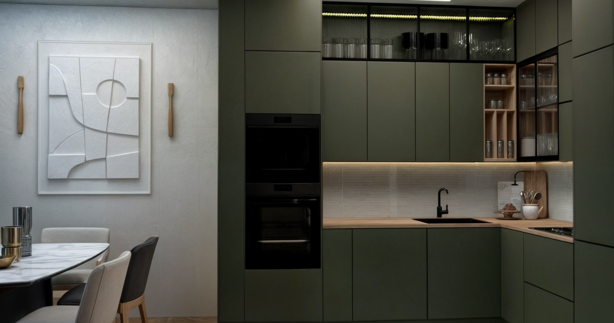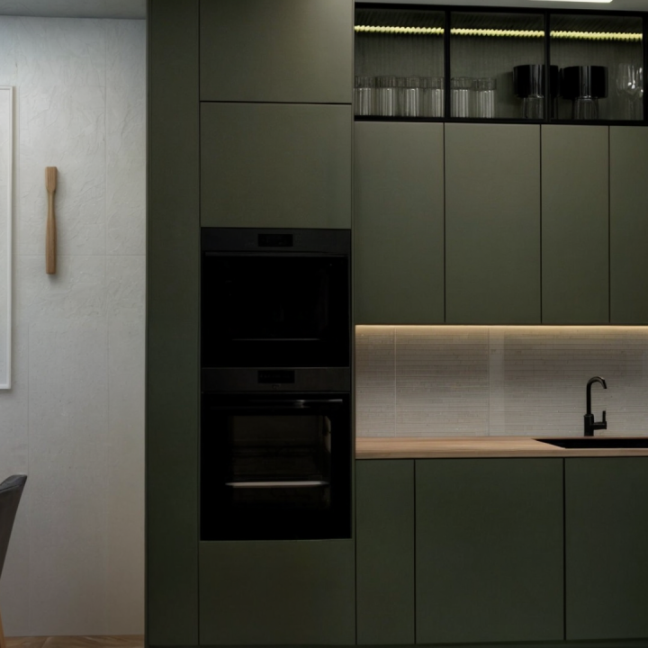 Dizajn kuhinje karakterišu smelo odabrane tamnozelene mat fronte koje unose eleganciju i sofisticiranost. Kuhinjski elementi u visokom sjaju, sa minimalističkim linijama, omogućavaju maksimalno iskorišćenje prostora i stvaraju čist i moderan izgled.
