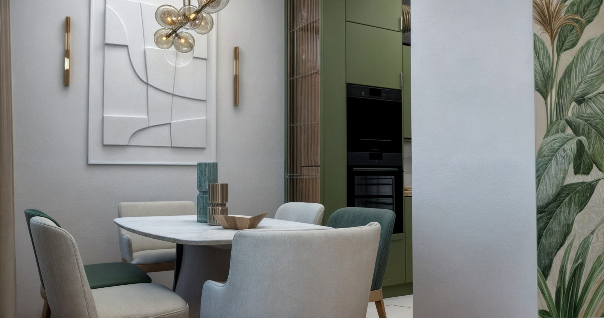 Poseban akcenat stavljen je na ukrasni mural sa floralnim motivima, koji unosi svežinu i povezuje enterijer s prirodnim elementima. Zlatni detalji na rasveti i ukrasima daju dodatnu dozu sofisticiranosti i luksuza.