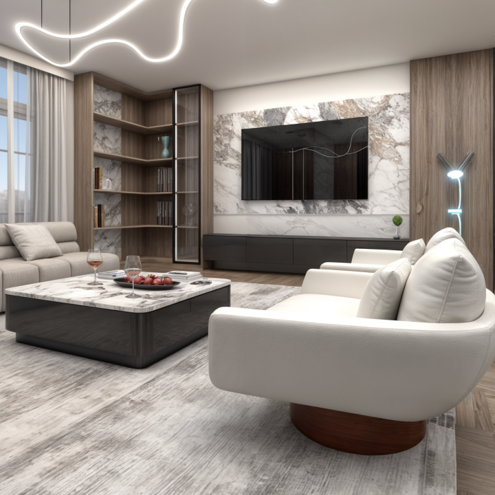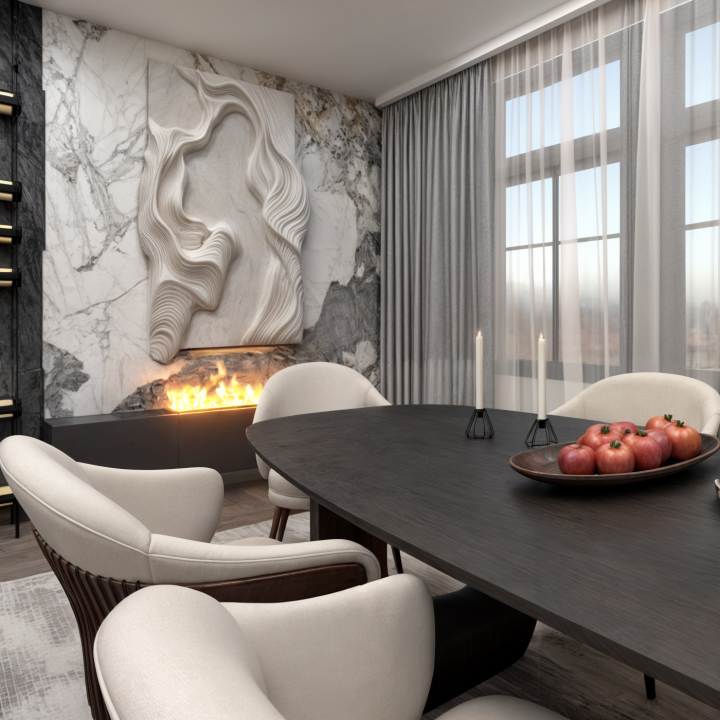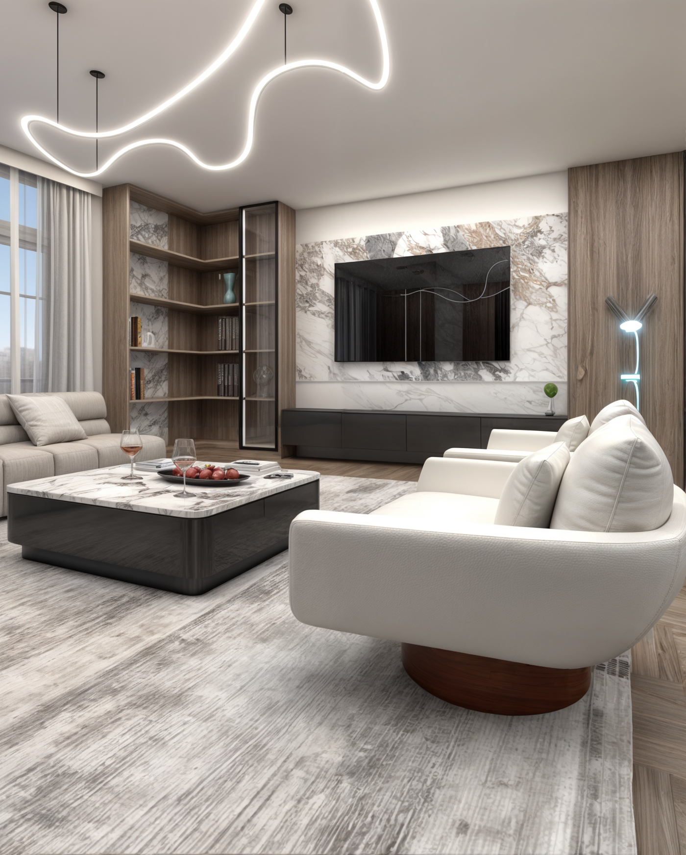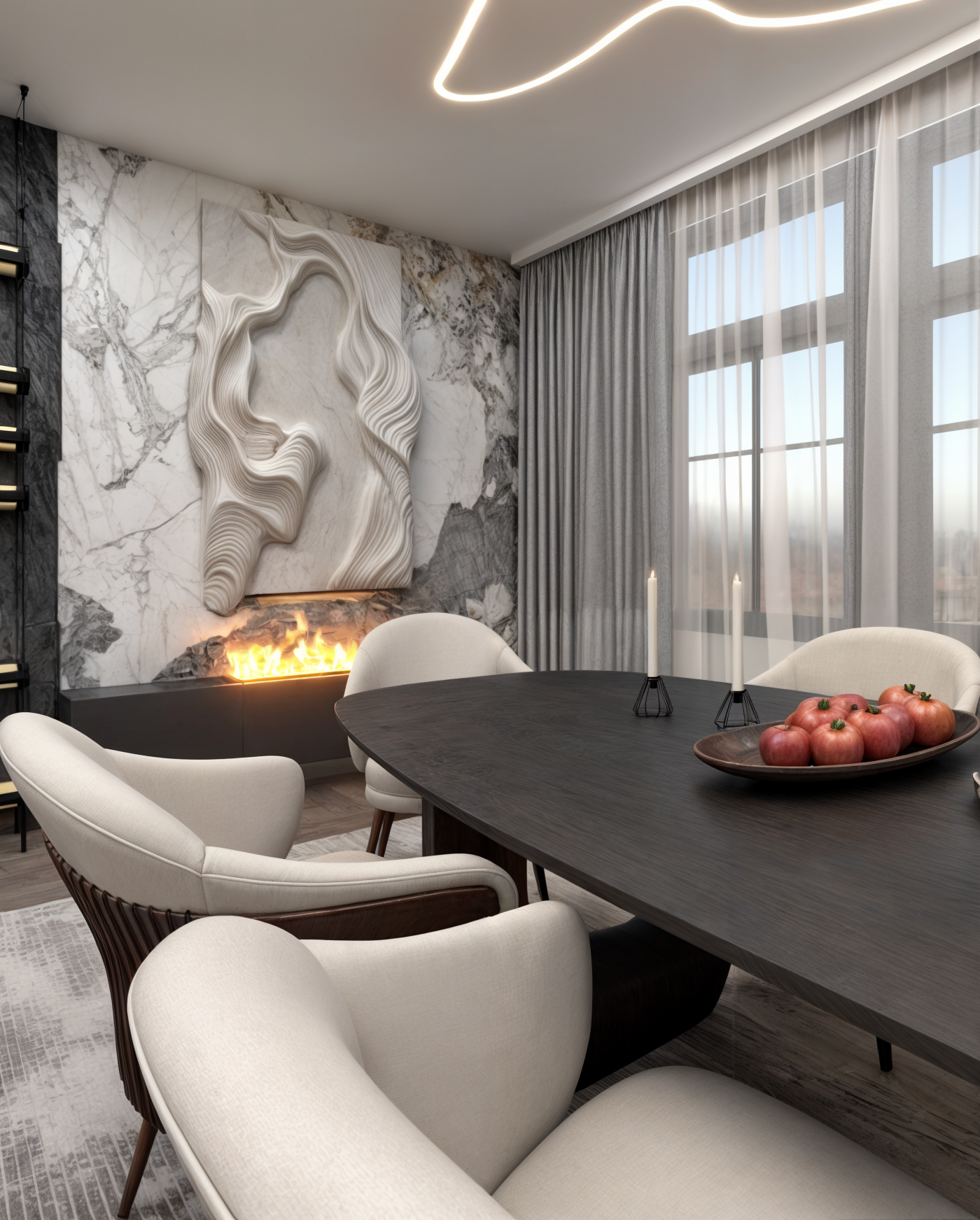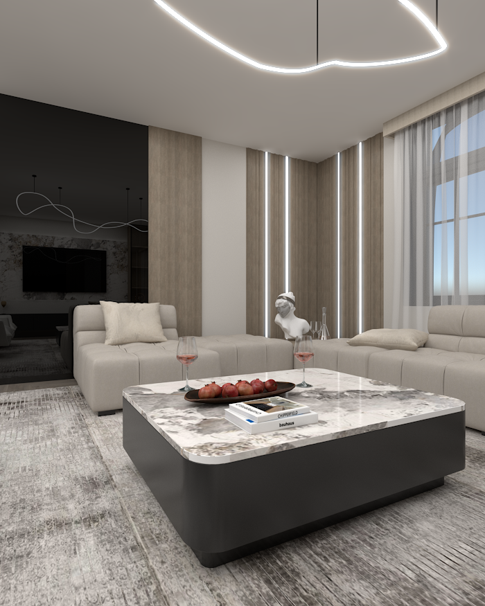 Dnevna soba je savršeno osmišljena za opuštanje, sa neutralnim tonovima koji dominiraju prostorom i luksuznim detaljima poput mermernih površina. Nameštaj sa zaobljenim linijama pruža udobnost i vizuelni balans, dok pažljivo postavljeni elementi poput dekorativnih polica i kamina dodaju dubinu i karakter prostoru.