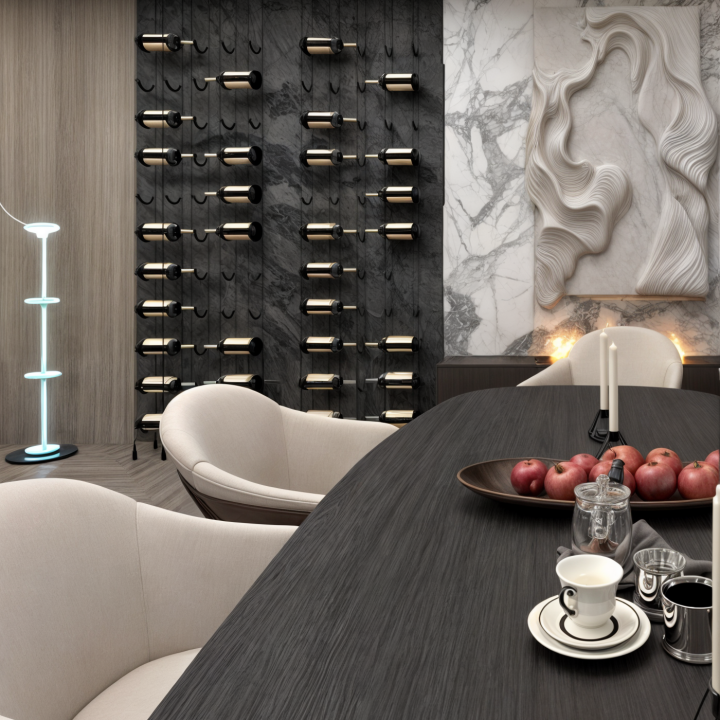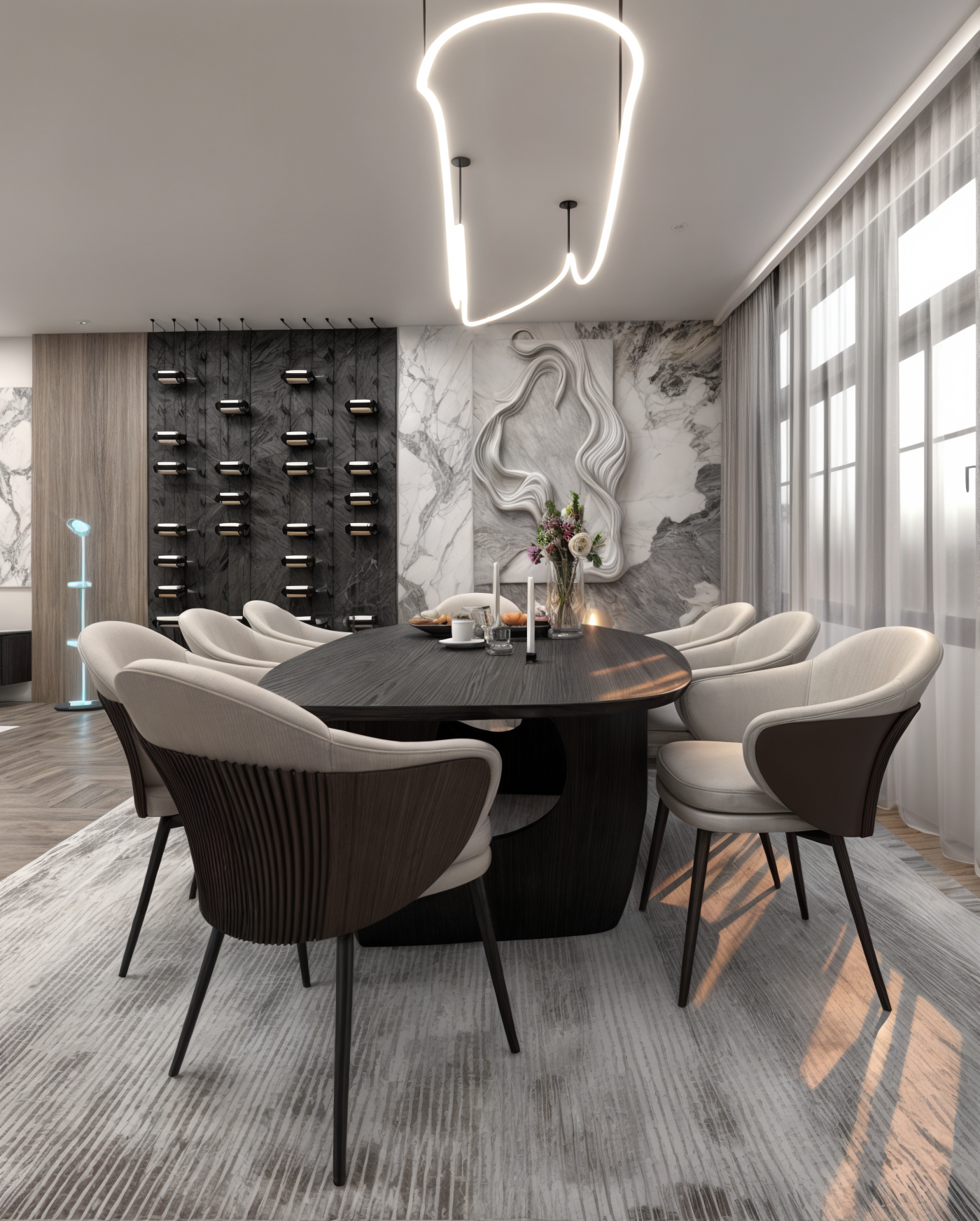 Trpezarijski prostor naglašava toplu atmosferu i vrhunski komfor. Okrugli sto od tamnog drveta i stolice modernog dizajna kreiraju pozivajući ambijent za uživanje u obrocima. Zidna umetnost i integrisana rasveta doprinose osećaju luksuza i jedinstvenosti.
