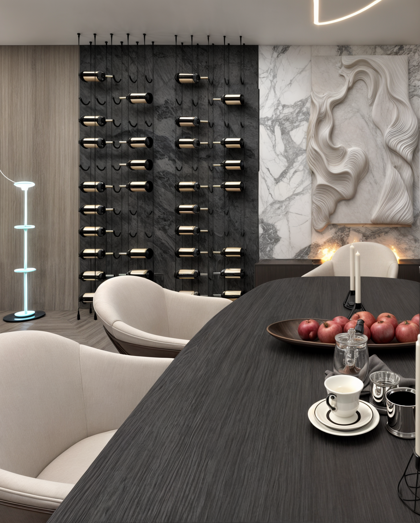 Kombinacija prirodnih materijala, poput mermera i drveta, sa modernim akcentima kao što su LED osvetljenje i minimalistički dizajn nameštaja, daje prostoru bezvremensku privlačnost. Skulpturalni detalji na zidovima predstavljaju centralne tačke koje privlače pažnju i dodaju umetnički izraz.