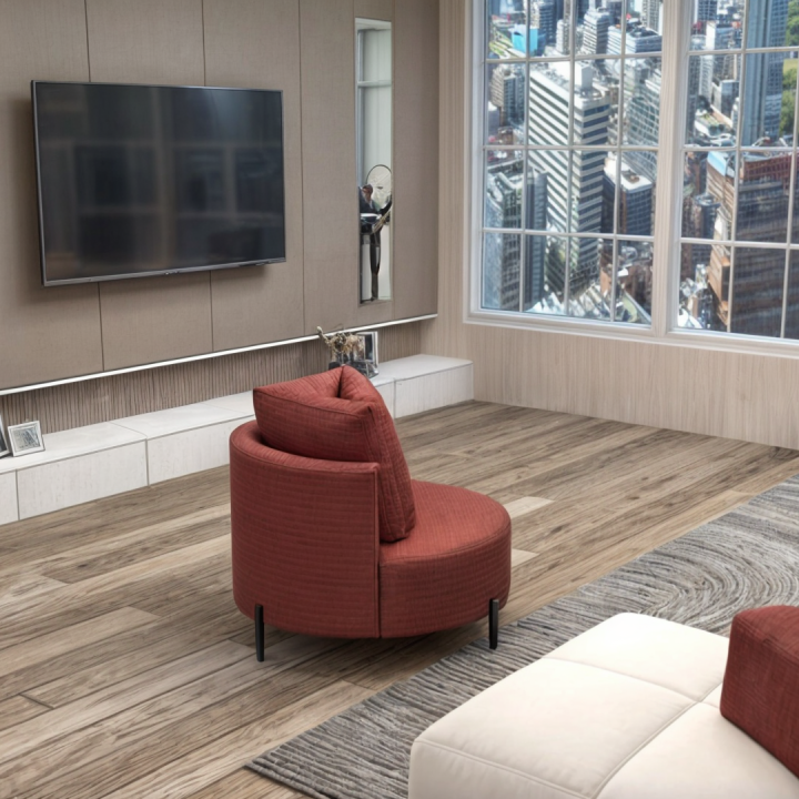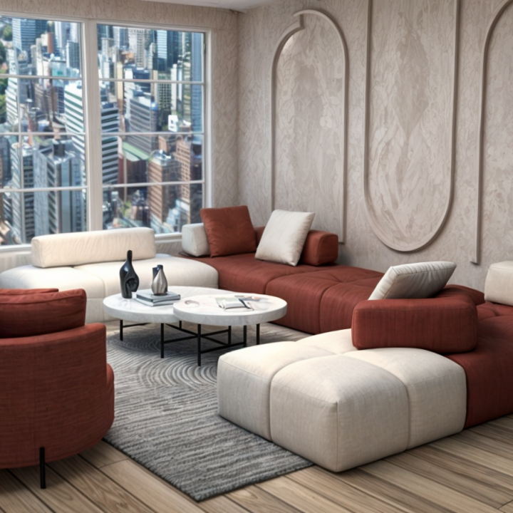Dnevna soba karakteriše prozračan i svetao dizajn, sa velikim staklenim prozorima koji pružaju pogled na urbani pejzaž. Paleta boja kombinuje tonove bele i crvene, dok je modularni nameštaj pažljivo odabran za maksimalnu fleksibilnost i komfor.