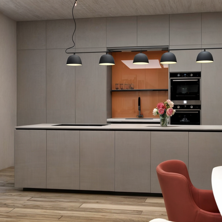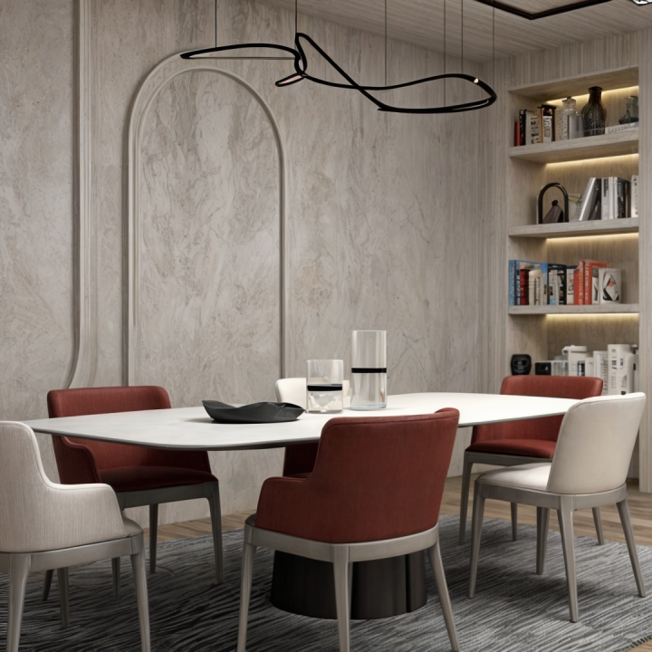 Trpezarija je dizajnirana sa naglaskom na eleganciju i intimnost. Kontrast toplih crvenih stolica i neutralnog nameštaja stvara vizuelnu ravnotežu, dok zidne dekoracije i rasveta dodaju savremeni umetnički pečat prostoru.