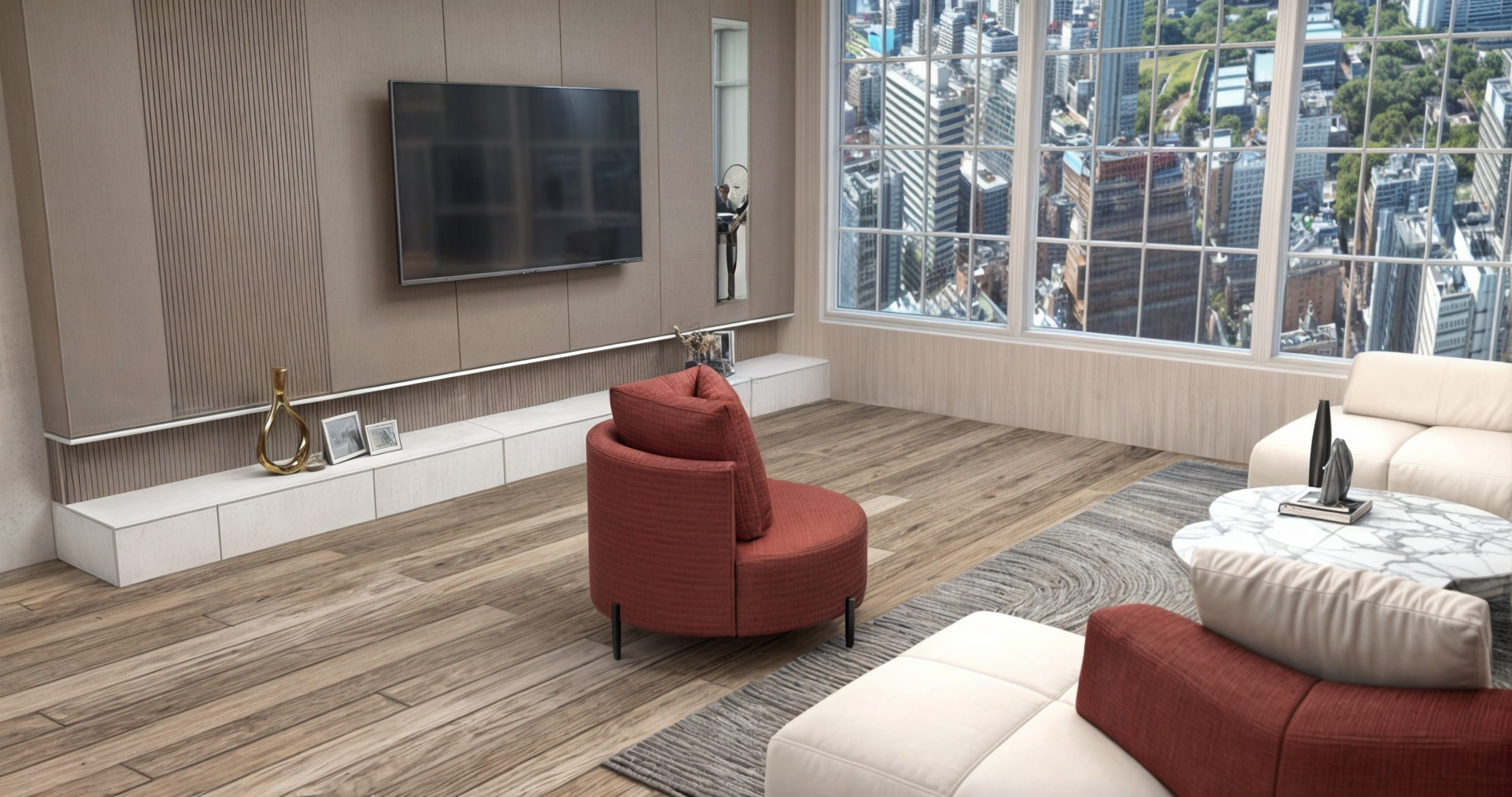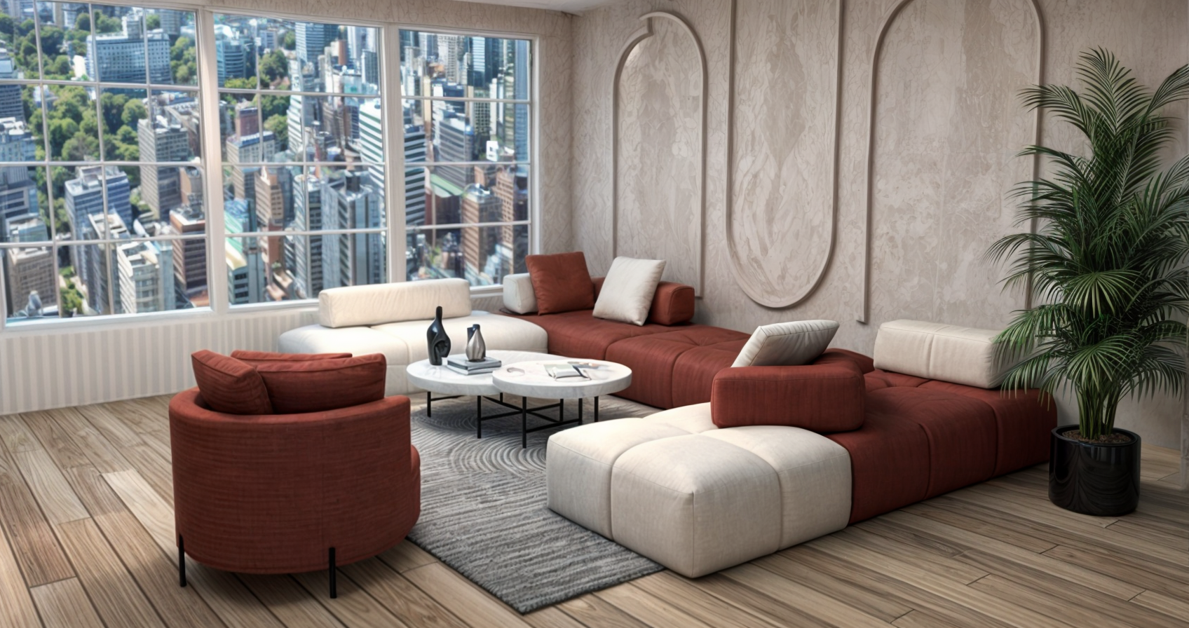 Dnevna soba karakteriše prozračan i svetao dizajn, sa velikim staklenim prozorima koji pružaju pogled na urbani pejzaž. Paleta boja kombinuje tonove bele i crvene, dok je modularni nameštaj pažljivo odabran za maksimalnu fleksibilnost i komfor.