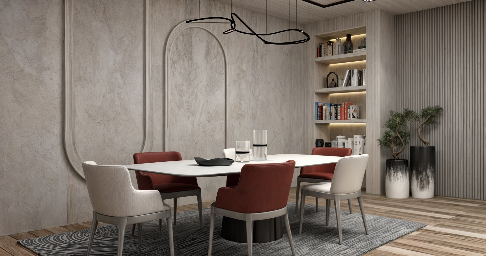Trpezarija je dizajnirana sa naglaskom na eleganciju i intimnost. Kontrast toplih crvenih stolica i neutralnog nameštaja stvara vizuelnu ravnotežu, dok zidne dekoracije i rasveta dodaju savremeni umetnički pečat prostoru.