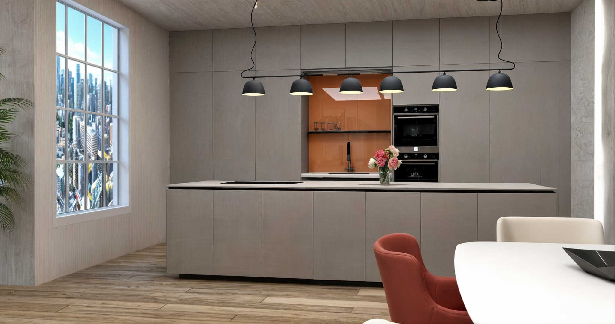 Kuhinja se ističe svojim modernim i minimalističkim izgledom. Monohromatske površine i crni detalji pružaju luksuzni osećaj, dok centralni kuhinjski deo omogućava praktičnost i funkcionalnost.