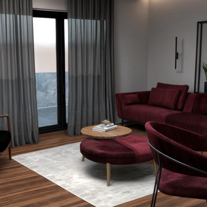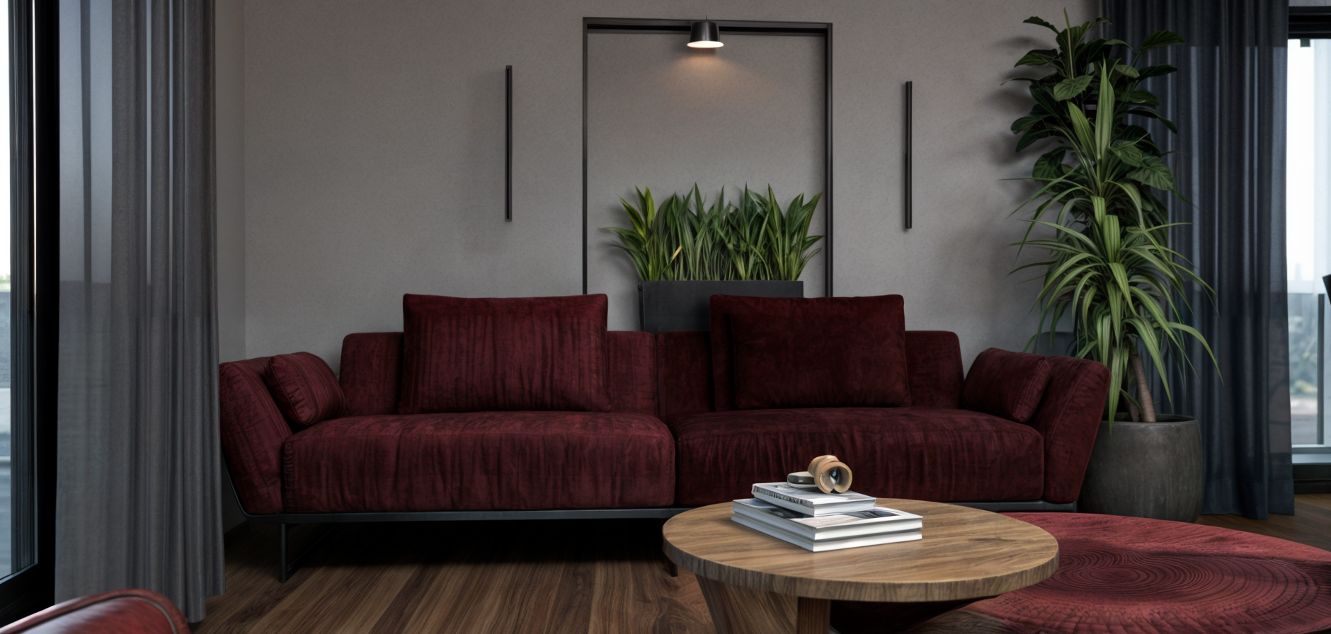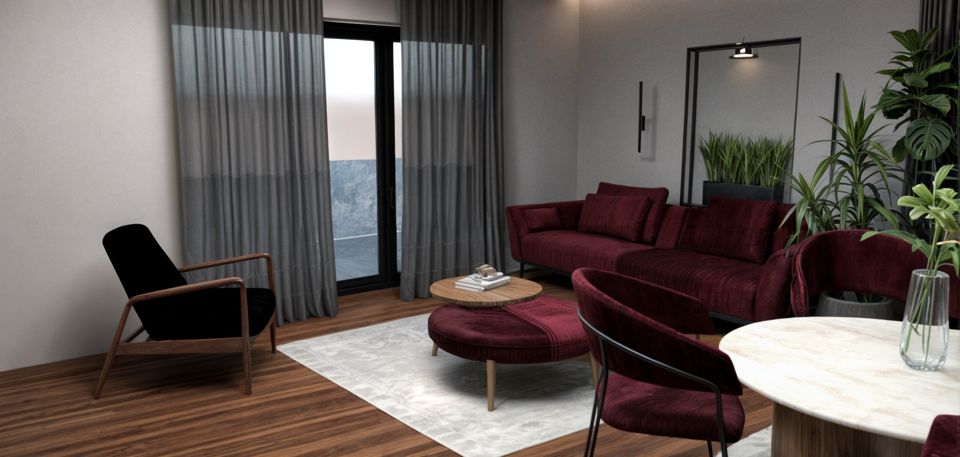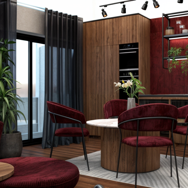 Inspiracija za dizajn dolazi iz kombinacije savremenih trendova i klasičnih vrednosti. Poseban akcenat stavljen je na teksture, boje i osvetljenje, kako bi svaki kutak priča svoju priču. Dominantne nijanse bordo crvene, prirodni drveni tonovi i detalji od crnog metala stvaraju sofisticiranu atmosferu, dok zeleni elementi unose svežinu i povezanost s prirodom.